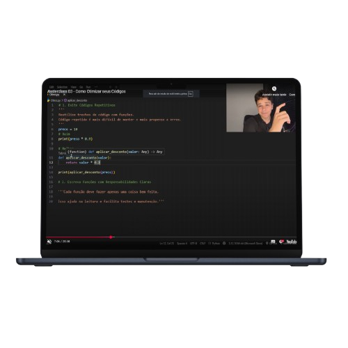 Descubra técnicas práticas para deixar seus códigos mais limpos, rápidos e eficientes. Nessa masterclass, você vai aprender a identificar gargalos, eliminar repetições desnecessárias e aplicar boas práticas que fazem a diferença nos seus projetos.